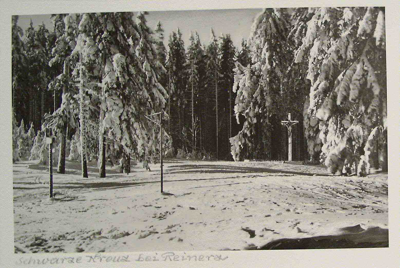 Da haben edle Gönner aus Ober-Gießhübel ein wirklich schönes, großes, neues Kreuz gespendet und ringsherum einen lebenden Zaun anpflanzen lassen. Unter einer ungewöhnlich großen Beteiligung aus Gießhübel, sowie aus den böhmischen und reichsdeutschen Orten wurde dieses neue "Schwarze Kreuz" vom Ortsseelsorger am 3.6.1934 eingeweiht, wonach eine Ansprache über die Bedeutung des hl. Kreuzes folgte. Wegen der derzeit herrschenden Grenzverhältnisse durfte keiner der vielen anwesenden preußischen Katholiken zum Kreuz kommen, sie mussten alle auf reichsdeutschem Gebiet bleiben und von dort aus der Andacht beiwohnen.