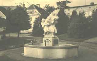 Unser Ehrenmal stellt eine Gruppe von zwei kämpfenden und zwei sterbenden Soldaten dar. Diese gehen in Gesellschaft des Todes einen dornigen Weg. Der Sockel ist ein Granitblock und befindet sich auf dem Ringplatz, in der Mitte eines Brunnens. Der vorn kämpfende Soldat ist ein Fahnenträger. Er hält die Fahne krampfhaft in seiner Hand, denn sie ist ihm wohl das Höchste, das er im Kampf besitzt. Man sieht keine Waffe bei ihm, er wird sie vielleicht im Kampfgetümmel verloren haben, oder nicht mehr gebrauchen können, weil sein Ende naht. Der Tod, der sich zu ihm gesellt hat, umklammert den Schaft der Fahne. Der Sterbende hebt das Haupt gegen den Himmel, als wolle er sagen: Ich kann nicht mehr!