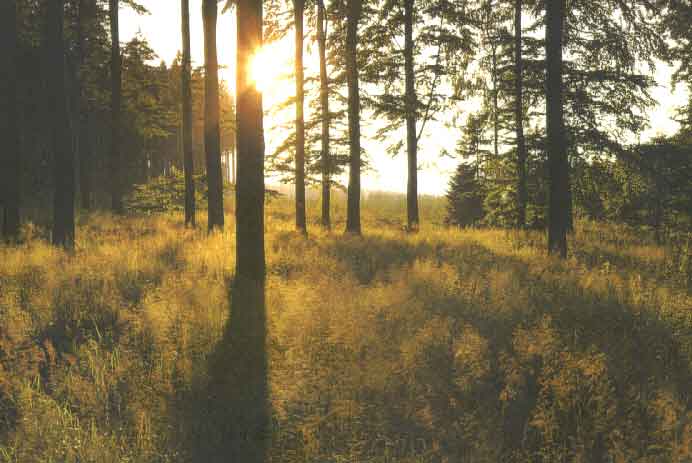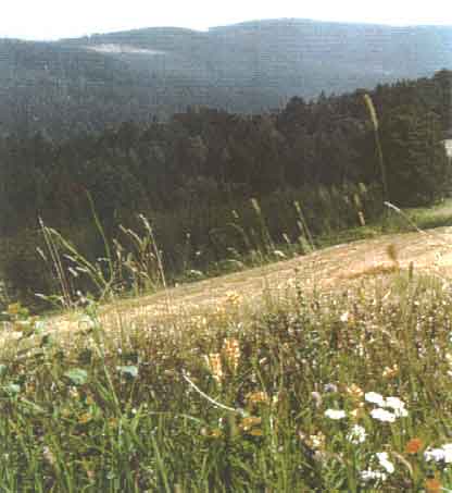 auf zwei Seiten vom Gemeindewald umgeben, auf einer Seite von einer Anhöhe, die