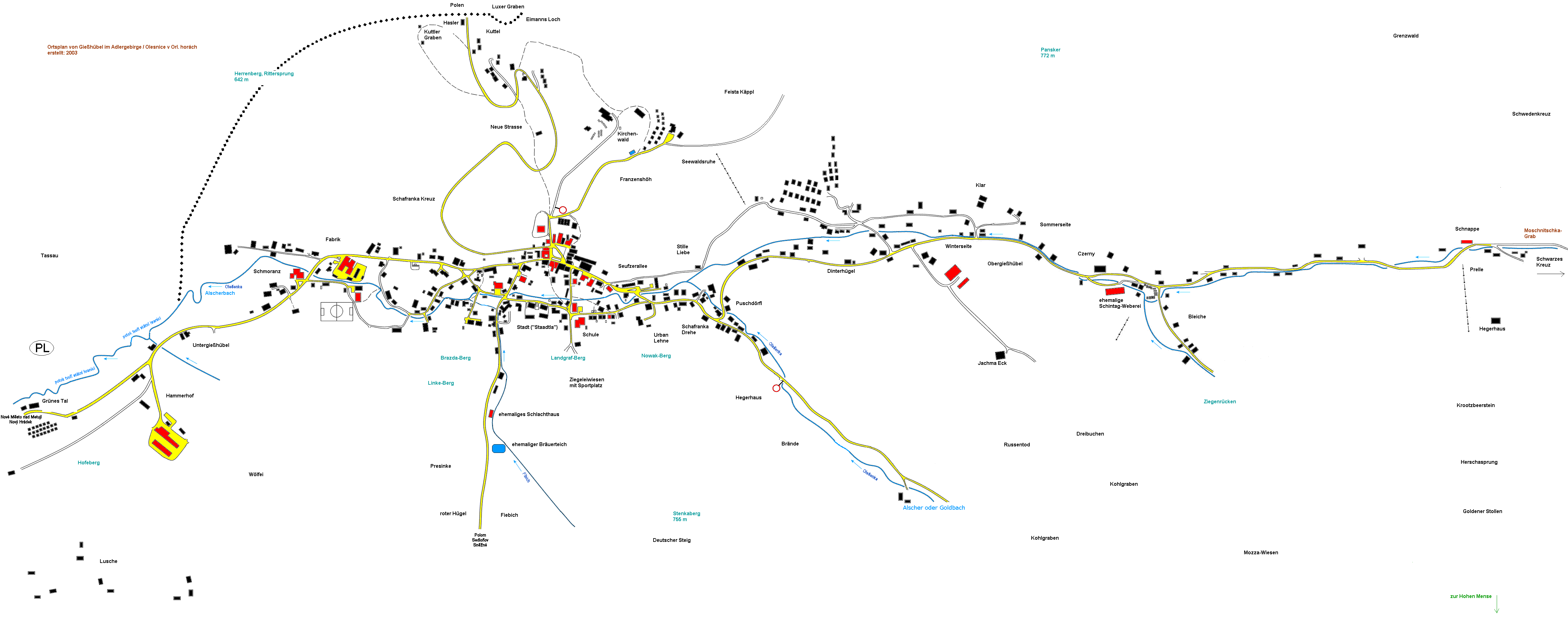 Gießhübel mit seinen 1425 Einwohnern liegt 605 m über dem Meere am Nordwest-Fuße der Hohen Mense, dem schönsten Aussichtspunkte des Oberen Adlergebirges, hart an der Reichsgrenze in unmittelbarer Nachbarschaft der weltbekannten Badeorte der Grafschaft Glatz: Reinerz, Kudowa, Altheide.