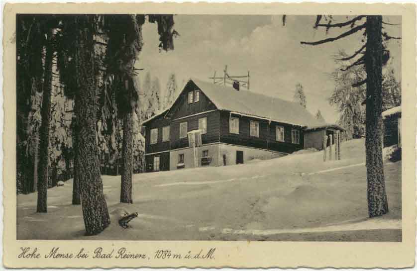 Die Hohe Mense-Baude auf der preuß. Seite des Mensegipfels in 1084 m Seehöhe mit neuzeitlich eingerichteten Fremdenzimmern ist seit Jahren ein von Skiläufern geschätzter Stützpunkt inmitten eines prächtigen Skigeländes.